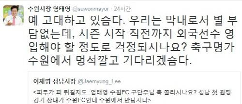 성남FC와 수원FC가 새 시즌 K리그 클래식 개막을 앞두고 구단주인 이재명(52) 성남 시장과 염태영(56) 수원 시장의 유쾌한 입씨름으로 주목받고 있다. 이 시장은 지난 2일 자신의 트위터에 아르헨티나 출신 공격형 미드필더 피투(32)의 영입을 밝히면서 ‘피투가 피 튀길지도’라며 ‘염태영 수원FC 구단주님 혹 쫄리시나요? 성남 첫 원정경기 상대가 수원FC인데 수원에서 만납시다’라고 글을 남겼다. 또 수원FC가 역사적인 첫 클래식 홈경기를 성남과 치르면서 관중 무료 입장을 검토한다는 기사를 인용하면서 ‘염 구단주님, 성남에서도 많이 갈게요. 겁 먹지 마세요’라고 도발했다. 염 시장은 이 글을 공유하더니 ‘예 고대하고 있습니다. 우리는 막내로서 별 부담없는데, 시즌 시작 직전까지 외국인 선수를 영입해야 할 정도로 걱정되시나요? 축구명가 수원에서 멍석깔고 기다리고 있겠습니다’라고 응수했다.