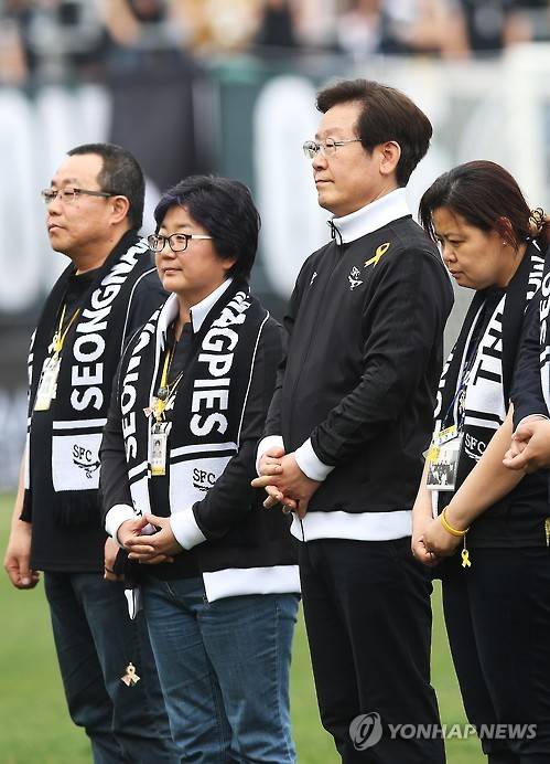 (성남=연합뉴스) 홍기원 기자 = 13일 오후 경기도 성남시 분당구 탄천종합운동장에서 열린 2016 현대오일뱅크 K리그 클래식 성남FC와 전남 드래곤즈의 경기. 이재명 성남시장이 세월호 희생자 가족들과 참사 2주년 추모 행사를 갖고 있다. 2016.4.13