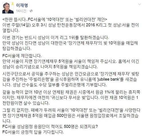 이재명 시장은 "서울이 패배가 두려워 10억대전을 사양한다면 장기연체채권 5억원 매입금 500만원은 서울 원정 팬 입장료에서 조달하겠다. 긍정적 답변을 기다린다"고 밝혔다.