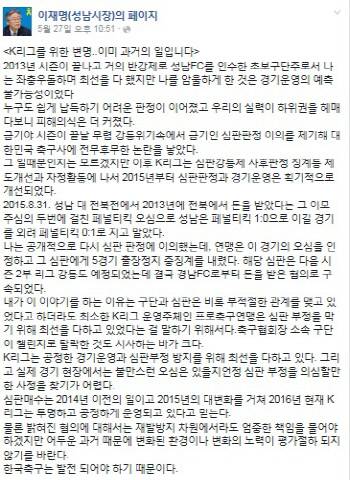 이런 화두는 성남FC의 구단주인 이재명 성남시장이 먼저 던졌다. 이 시장은 지난 27일 자신의 페이스북에 ‘K리그를 위한 변명, 이미 과거의 일입니다’는 제목으로 장문의 글을 올렸다. 이 글에서 이 시장은 “성남 구단을 거의 반강제로 인수한 뒤 누구도 쉽게 납득하기 어려운 판정이 이어졌고 피해의식은 더 커졌다. 급기야 (2014)시즌이 끝날 무렵 강등위기속에서 금기인 심판판정 이의를 제기해 대한민국 축구사에 전무후무한 논란을 낳았다”고 회고했다. 이어 “그일 때문인지는 모르겠지만 이후 K리그는 심판강등제, 사후판정 징계 등 제도개선과 자정활동에 나서 2015년부터는 심판판정과 경기운영은 획기적으로 개선됐다”며 “K리그는 공정한 경기운영과 심판부정 방지를 위해 최선을 다하고 있다. 심판매수는 2014년 이전의 일이고 2015년의 대변화를 거쳐 현재 K리그는 투명하고 공정하게 운영되고 있다고 믿는다”고 말했다. 이 시장은 “밝혀진 혐의에 대해서는 재발 방지 차원에서라도 엄중한 책임을 물어야 하겠지만 어두운 과거때문에 변화된 환경이나 변화의 노력이 평가절하되지 않기를 바란다”고 희망했다. 성남FC의 구단주로서 그동안 누구보다 심판 문제에 대해서 목소리를 높였던 이 시장이 ‘(관행이 성행했던)어두운 과거’와 ‘(제도적 보완이 획기적으로 시도된 2015년 이후의)변화된 환경과 노력’을 분리해서 논한 것은 의미가 있다는 지적이다.